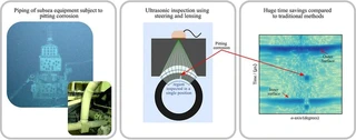 Pipes that transport acidic fluids are prone to pitting corrosion, which causes well-localized thickness loss. The detection and measurement of these small flaws via ultrasonic non-destructive testing (UT) requires a fine sampling of the surface of the pipe, which is time-consuming and expensive, especially in places where the inspections require dedicated infrastructure, such as subsea facilities. In this work, we present an acoustic lens that, used with a UT phased array system capable of beam steering, allows for the inspection of large sections (e.g., 90 degrees) of a submerged pipe without any mechanical displacement. The mathematical formulation is derived from geometrical optics, and algorithmic procedures to compute customized delay laws are provided. Practical aspects of the manufacturing and assembly of the device are also described. Spatial resolutions of a prototypical manufactured lens on three axes are assessed on a 140 mm-diameter pipe and compared to those obtained with a moving single-element transducer, showing competitive resolutions. Measurements of the remaining thicknesses of 1.5 mm-diameter machined flaws performed with the device provided a mean absolute error of 19% of one wavelength and maximum absolute error of 51% ($\lambda = 1.18$ mm). The results demonstrate the potential of the proposed concept to replace single-element UT, significantly reducing inspection time by removing mechanical displacement otherwise necessary during an axial sweep.