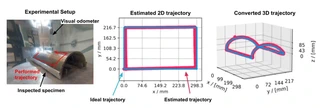 Odometer information is an important feature of NDT systems for inspection procedures that involve mechanical scanning. Knowledge of transducer position during the inspection allows for the localization of flaws and the fusion (stitching) of several images into more sophisticated representations of the inspected object. Commercial encoders provide NDT systems with accurate realtime displacement information that can be integrated to obtain odometry. However, this information is typically limited to a single axis. Although composite schemes with more than one encoder can be built to provide 2-D or 3-D spatial information, they are mechanically intricate and lack flexibility and ease of use. We propose a 2-D position-tracking solution that is based on image processing. A miniature camera continuously captures images of the external surface of the inspected object, which are fed to an algorithm that detects and stores 2-D displacement between each pair of consecutive images. Additionally, the orientation quaternions provided by an Inertial Measurement Unit are stored, allowing for posterior 3-D path reconstruction over objects of known geometries, such as oil pipes. Besides logging position and orientation histories, the device also provides real-time displacement information to the NDT system, where it is perceived as a set of single-axis encoders, thus termed “the virtual encoder”. We demonstrate the applicability of the device to both contact and immersion ultrasonic inspections. The results show that the concept is promising, despite being based on simple principles and relatively easy to implement. The source code is provided as additional material in https://github.com/thiagokalid/VirtualEncoder-ECNDT-2023.